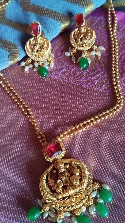 Gold Chain with lakshmi pendent and ruby and Emerlad